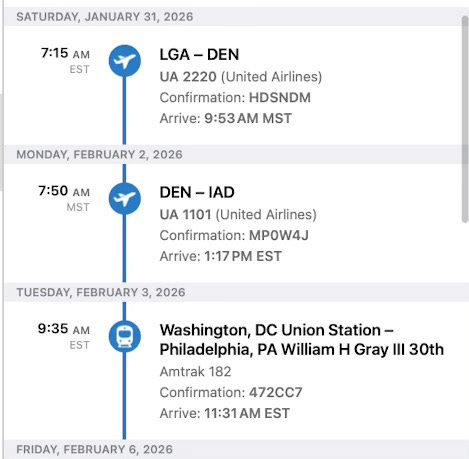 This means that I don’t need to remember anything, or sort through various apps and logins. When you are not only the performer and producer, but also the tour manager, you don’t need to waste mental energy on confirmation numbers or gate information. Below, you can see what my TripIt looks like for the first few days of the tour. Notice how it gives my flight number, departure and arrival time, and easily switches between planes and trains.